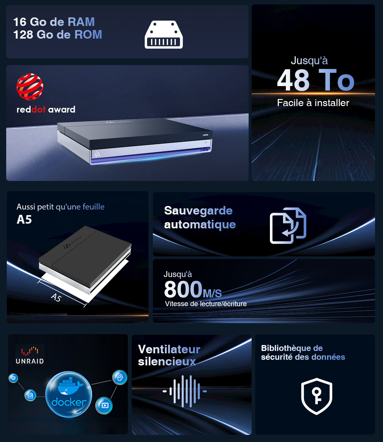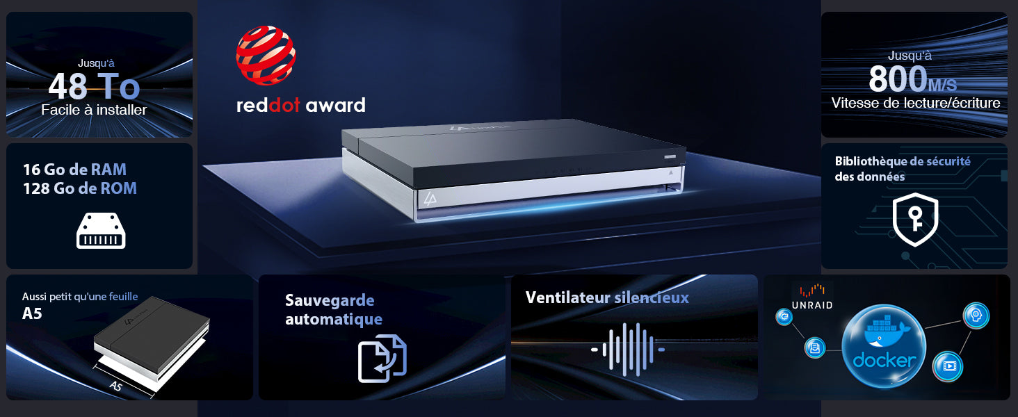 - Notre stockage en réseau utilise une matrice de disques unraid qui ne provoque pas de perte de données même si un disque est endommagé, ce qui garantit la sécurité maximale des données de l'utilisateur. Prend en charge la sauvegarde automatique, le téléchargement à distance, les albums photo intelligents, la lecture de musique, la partition intelligente.