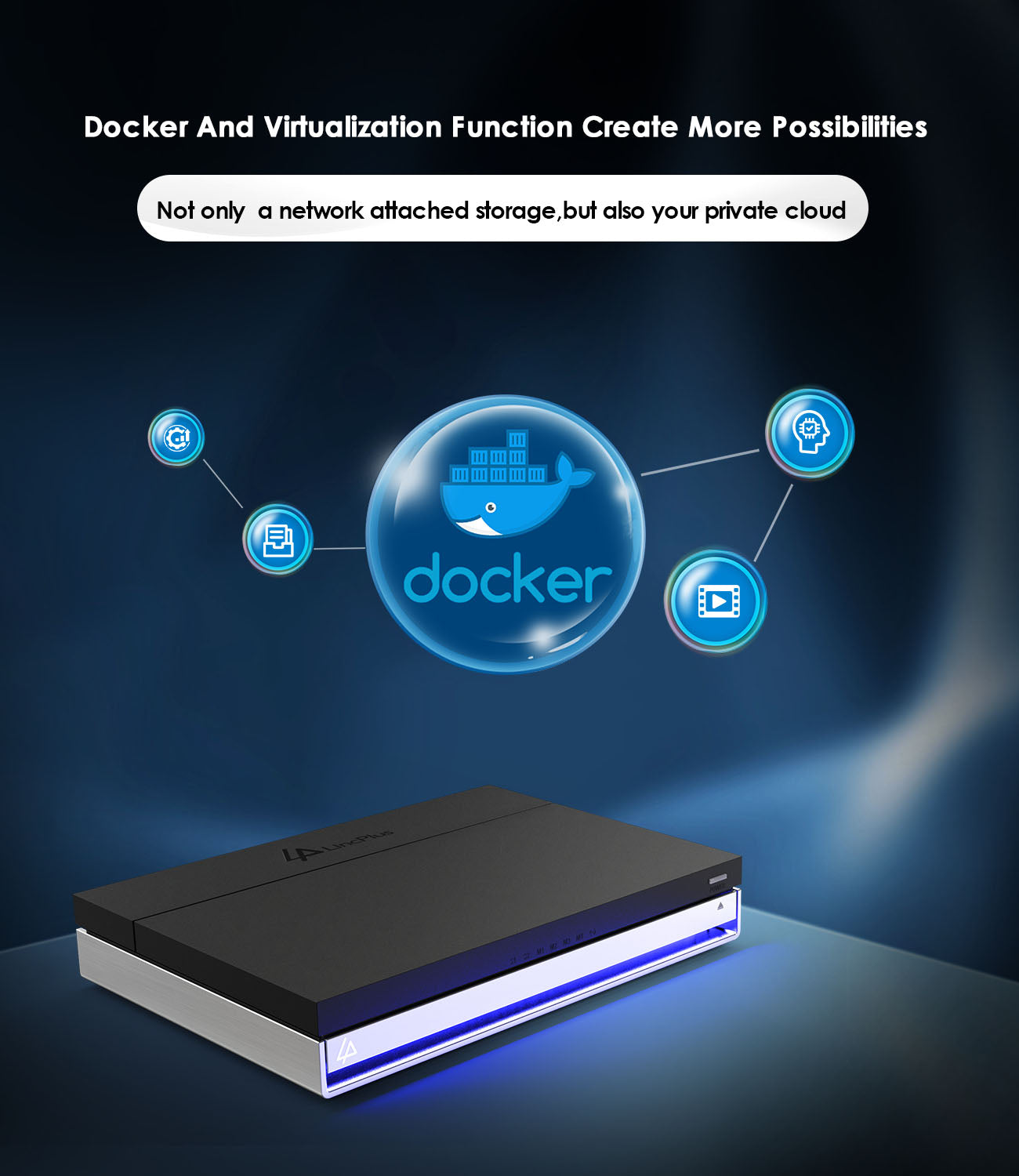 - Ce mini NAS prend en charge le docker et la virtualisation complets et est livré avec une licence unraid. Déployez et installez docker application suite en un clic. Prend en charge la construction de machines virtuelles dans le système, l'installation d'Android, Linux, Windows et support Hardware traversant(version unraid). Le LincStation NAS n'est pas seulement votre stockage connecté au réseau, c'est aussi un puissant cloud privé et un serveur domestique.