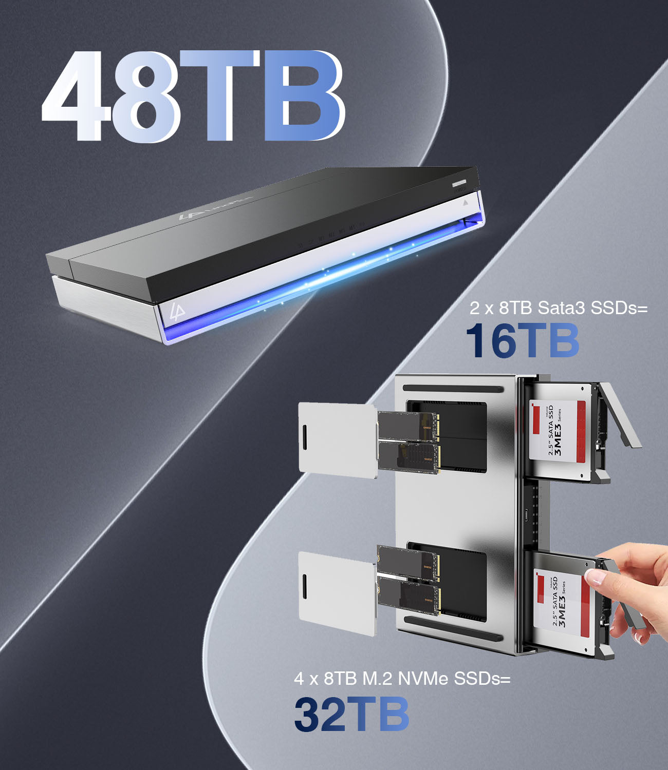 Combinant 2 disques SSD Sata3 de 8 To avec 4 disques SSD M.2 NVMe de 8 To, LincPlus LincStation N1 offre une capacité maximale de 48 To. Stockez vos données de manière flexible dans un cloud privé avec une propriété à 100 %